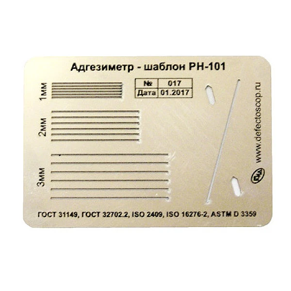 Адгезиметр выполнен в виде шаблона из нержавеющей стали с прорезями для нанесения надрезов.