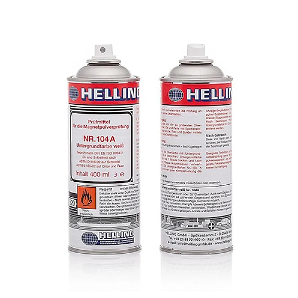 Белая фоновая краска, которая не требует удаления перед дальнейшим окрашиванием деталей. Представляет собой суспензию белого пигмента в слаболетучем растворителе без хлоруглеводородов. Имеет короткое время высыхания (около 2 мин при 20°C). Образует очень равномерный фоновый слой на проверяемой поверхности. Наносить слоем до 30 мкм. Аэрозольные средства контроля HELLING не содержат фторхлоруглеводородов и отвечают требованиям ASME-Code, Sect. V, ASTM E 709 и EN ISO 9934.