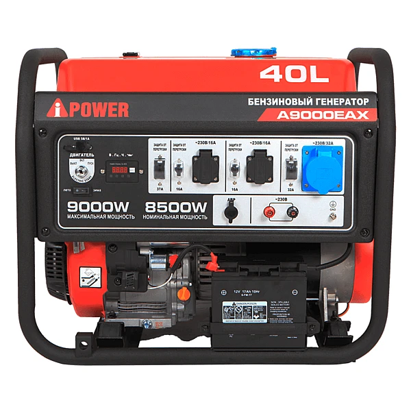 Бензиновый генератор A-iPower A9000EAX - надежный источник питания мощностью 8.5 кВт. Главное преимущество этой и других моделей производителя с индексом X заключается в способности выдерживать большую пусковую мощность, в данном случае - до 16 кВА. Такая особенность делает установку отличным выбором для работы с профессиональным ручным инструментом и электродвигателями.