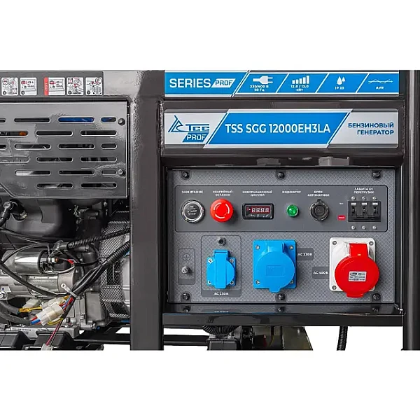 Предусмотрены два варианты организации схемы для снятия полной мощности с электрогенератора TSS SGG 12000EH3LA - через силовые розетки на 230В или 400В, последняя используется для трехфазных потребителей. На передней панели также расположена стандартная евророзетка для питания нетребовательных устройств.