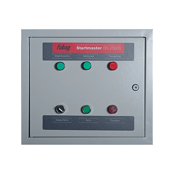 Блок автоматики FUBAG Startmaster BS 25000 (230V) оснащен встроенным контроллером, отслеживающим уровень напряжения во внешней сети и управляющим коммутационными устройствами, которые обеспечивают запуск и остановку двигателя генератора и производят подключение потребителей к стационарному или автономному источнику переменного тока.