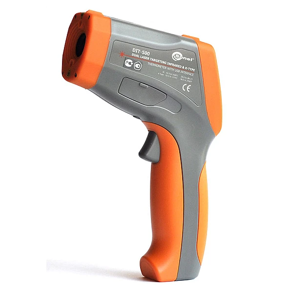 DIT-500 – инфракрасный измеритель температуры (пирометр). Современный прибор, позволяющий бесконтактным методом измерить температуру поверхности любых объектов: электронные компоненты, пластик, металл, дорожные покрытия, пластик, дерево, легко воспламеняемые объекты.