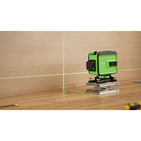 Лазерный нивелир RGK PR-38G - это уровень с 3 замкнутыми плоскостями для выполнения строительных, отделочных и дизайнерских работ в помещениях и за их пределами. Прибор проецирует 1 горизонтальный луч на высоте 2.3 см от пола и 2 взаимно перпендикулярных вертикальных. Зеленые лучи обладают лучшей видимостью в сравнении с красными, особенно в условиях хорошей освещенности. При точности ±0,2 мм/м рабочая дальность составляет 20 м, она может быть увеличена до 50 м при использовании приемника.