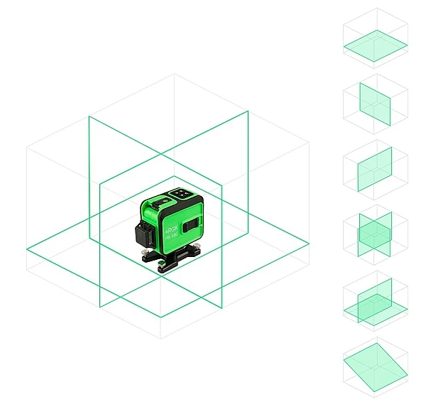 С помощью пульта ДУ можно заблокировать стабилизатор, переключить плоскости либо же отключить их вовсе. Раскладка дублирует кнопки на лазерном уровне во избежание ошибок. Для упрощения идентификации лучей на засвеченных стенах в набор входят зеленые очки.