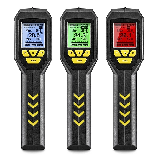 Зеленый дисплей с подсветкой TP10 легко читается в темноте. Изменение цвета дисплея по сигналу тревоги является удобной и экономящей время измерения функцией. Вы можете ввести пользовательские пороговые значения для измеренных минимальных и максимальных значений в устройстве. При температуре объекта ниже установленного предельного значения дисплей будет мигать синим, при превышении его, красным. В обоих случаях дополнительно будет подаваться звуковой сигнал тревоги. Благодаря этой интуитивно понятной цветовой индикации вы можете одним взглядом определить, находится ли измеренная температура в заданном диапазоне целевых значений. Следовательно, даже обследование большого количества объектов займет меньше времени из-за отсутствия необходимости уделять внимание каждому отдельному измеренному значению.