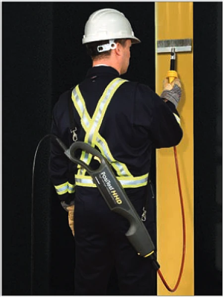 Электроискровой дефектоскоп PosiTest HHD первый в мире дефектоскоп комбинированного типа. Т.е. изначально прибор выполнен по схеме "жезл", когда оператор держит дефектоскоп двумя руками. Благодаря ручке-держателю прибор может быть использован как "поясной", т.е. закрепленный на ремне или плечевом ремне, а тестовый электрод устанавливается в ручку-держатель.