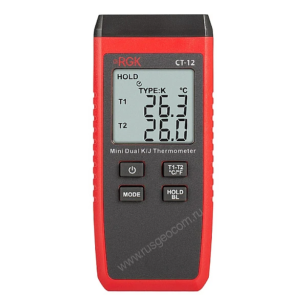 За счет небольшого веса компактный двухканальный цифровой термометр RGK CT-12 с зондом температуры воздуха TR-10A, поверхностным зондом TR-10S и погружным зондом температуры TR-10W удобен для проведения длительных инспекций в полевых условиях, легко помещается в карман одежды или сумки. С большого дисплея показания считываются легко и без путаницы между каналами. Корпус прибора выполнен из прочного пластика, снабжен рельефными участками для надежного захвата и выдерживает падение с метровой высоты.