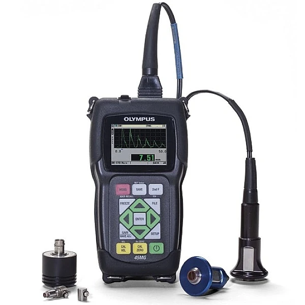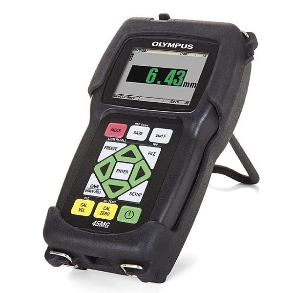 Прибор 45MG  - усовершенствованный ультразвуковой толщиномер, оснащенный стандартными функциями и дополнительным программным обеспечением для измерения толщины. Этот уникальный прибор совместим со всеми двух- и одноэлементными преобразователями производства Olympus, тем самым являясь комплексным решением практически во всех случаях контроля.