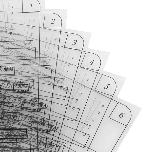 Универсальный шаблон радиографа УШР-5 это набор из 11 шаблонов прозрачной пленки, накладываемой на радиографический снимок сварного шва трубы магистрального трубопровода. Шаблон помогает быстро и точно оценить дефектность сварных соединений. УШР-5 создан под нормы руководящего документа АК «Транснефть» РД-25.160.10-КТН-016-15.